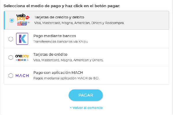 2 Al presionar "Pagar Ahora" Te llevará a esta pantalla de pago, escoge tu medio preferido para realizar la transacción